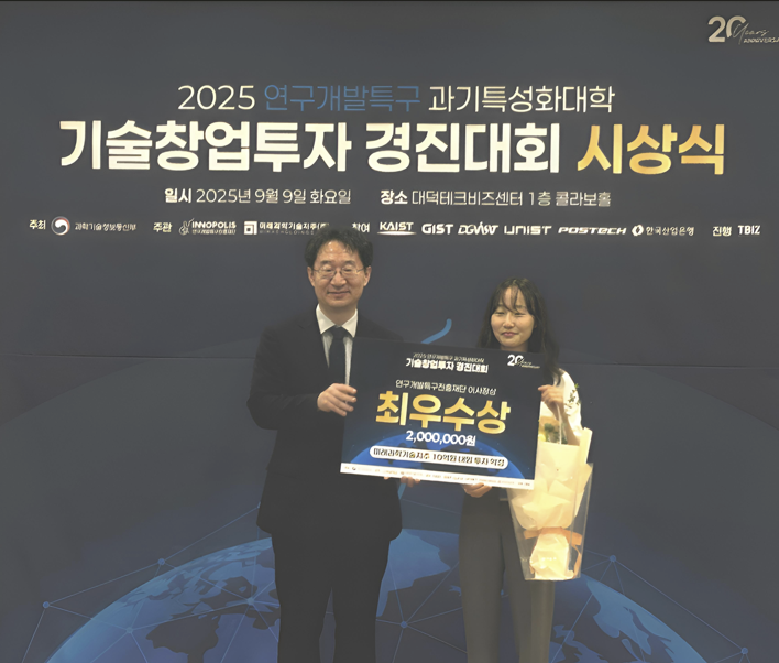 DGIST 학생 창업 기업 퀘스터와 엘엠엔틱바이오텍이 '2025 연구개발특구 과기특성화대학 기술 창업 투자 경진대회'에서 각각 최우수상과 우수상을 수상했습니다.