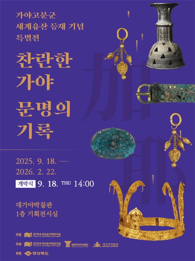 고령 지산동 고분군에서 유출돼 현재 도쿄 국립박물관에 소장 중인 금관 등 해외 29개 나라에 흩어져 있는 가야 유산 100여 점의 사진과 한국 국외 문화재 연구원이 일본 현지에서 환수한 '바리 모양 그릇받침'과 '금귀걸이' 등 대가야의 대표 유물을 전시합니다.