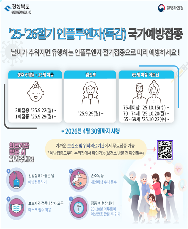 경상북도는 9월 22일부터 2026년 4월 30일까지 고위험군을 대상으로 인플루엔자 무료 예방 접종을 실시합니다.