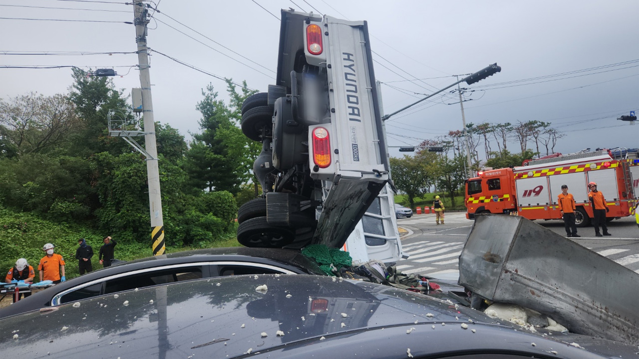 1톤 화물차가 옆으로 넘어지면서 신호 대기 중이던 승용차 2대를 덮쳤습니다.