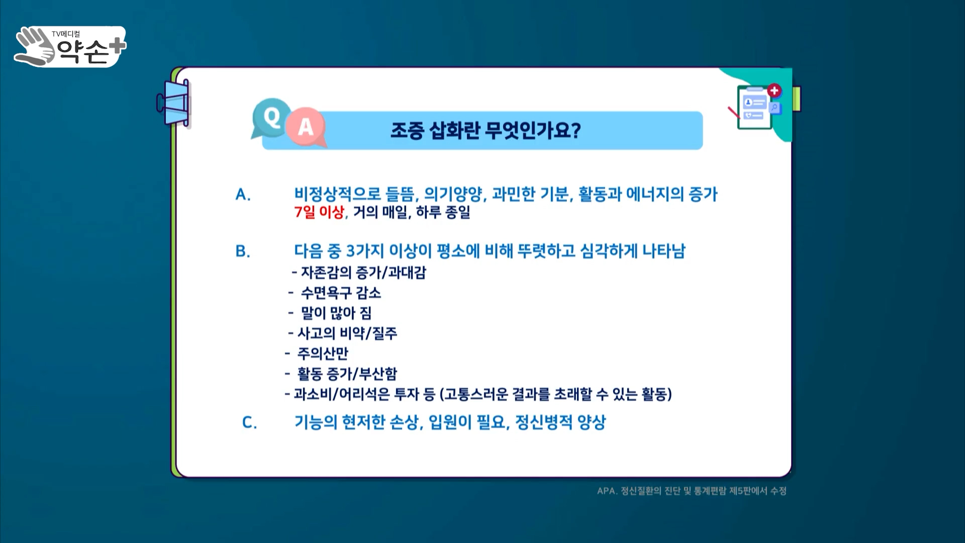 비정상적으로 기분이 들뜨고, 의기양양해지고, 때로는 너무 과민해져서 짜증을 많이 내거나 신경질적이 되기도 하고, 활동량이 증가하는 현상이 적어도 7일 이상, 거의 매일 지속되는 현상이 첫 번째로 있고요.