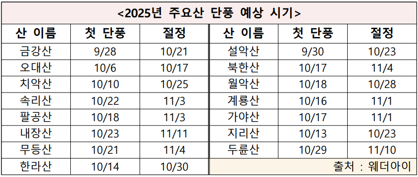 2025년 첫 단풍은 설악산에서 9월 30일쯤 시작되겠고요.