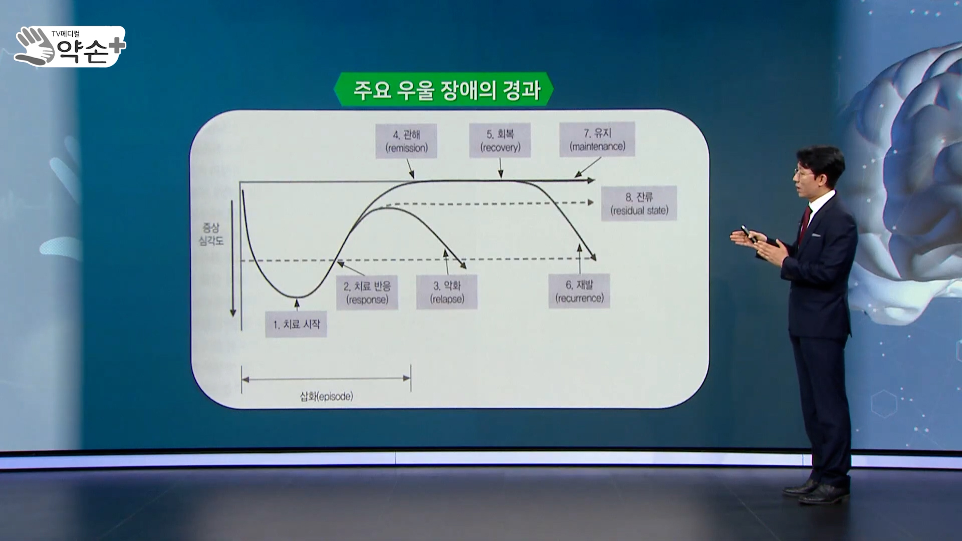 관해, 즉 증상이 완전히 사라진 상태로도 몇 달간 유지하셔야 합니다. 보통은 최소한 평균 6개월 이상, 처음 발병했을 때는 1년 정도 유지하도록 권유하고요. 스트레스에 노출이 되거나 스트레스가 없어도 때로는 계절의 변화나 다른 요인에 의해서도 우울증은 재발할 수가 있습니다.
