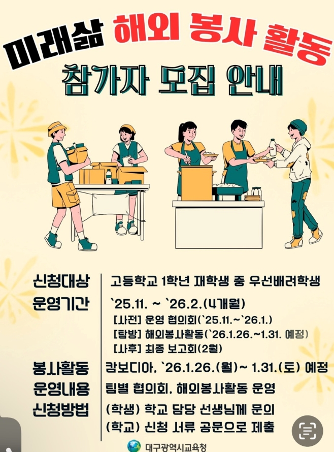 고등학교 1학년 재학생 가운데 선발된 우선 배려 대상자 약 30명과 인솔 교사 2명, 행정요원이 2026년 1월 26일부터 엿새간 캄보디아 현지에서 환경 정비와 배식, 교육 봉사 등을 진행할 예정이었습니다.