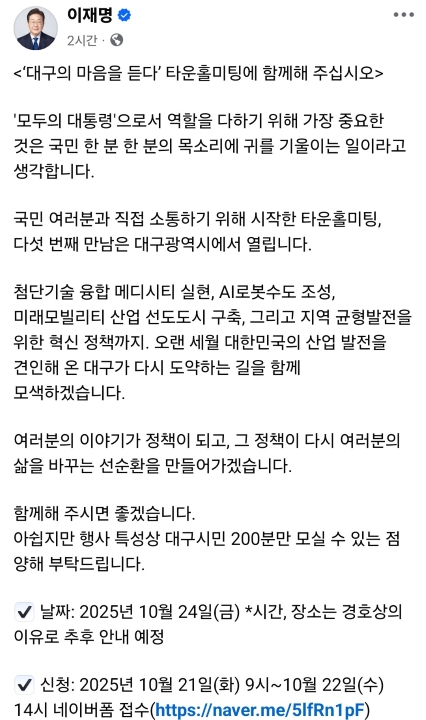 이재명 대통령이 오는 24일 대구에서 국민의 목소리를 직접 듣는 '타운홀미팅'을 엽니다.