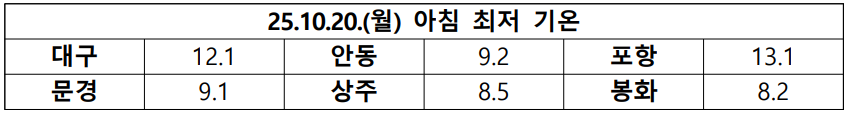 10월 20일 대구와 경북 대부분 지역에서 올가을 들어 가장 낮은 기온을 기록했는데요.