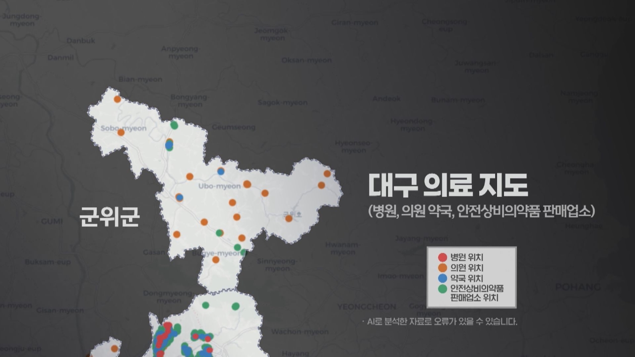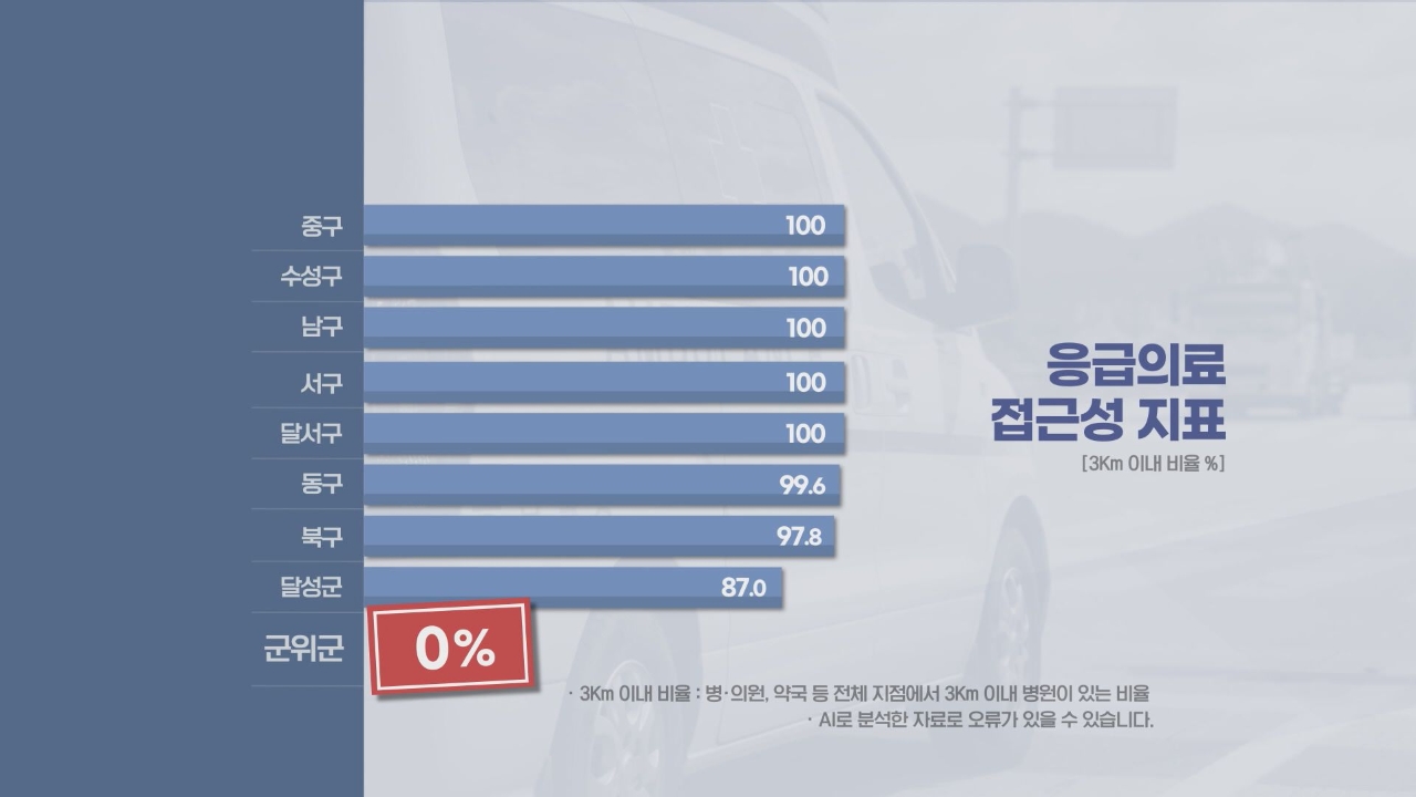 중구는 걸어서 5분이면 병원에 갈 수 있지만 군위군은 차량을 이용해도 40분, 최대 1시간까지 걸리는 것으로 분석됐습니다.