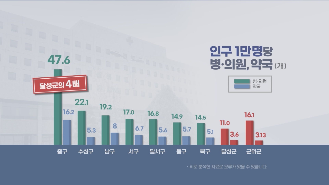 인구 1만 명당 병·의원 수를 비교하면 달성군이 11개로 가장 적고 다음으로 군위군 161개입니다.