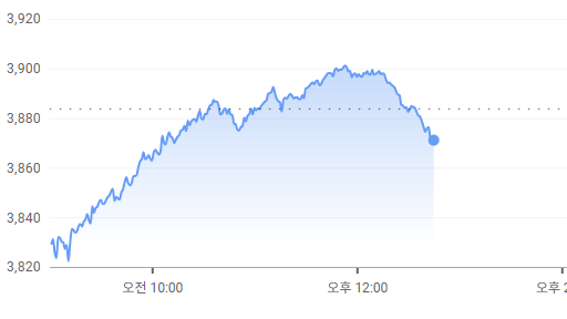10월 23일 코스피는 전장보다 1.23% 떨어진 3,835로 하락 출발했지만 점차 낙폭을 줄이다, 오전 11시 53분 3,902까지 오르며 사상 처음으로 3,900선을 넘겼습니다.