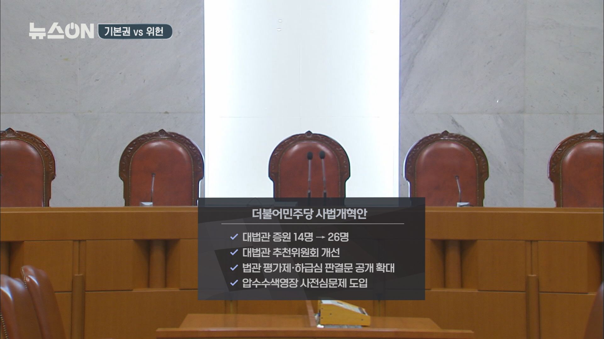 5대 사법 개혁안은 현재 14명인 대법원을 3년 동안 1년에 4명씩, 26명으로 늘리는 대법관 증원, 대법관 추천위원회 구성 다양화, 법관 평가제 도입, 하급심 판결문 공개 확대, 압수수색 영장 사전심문제 도입입니다. 사법개혁특위 위원장인 백혜련 의원이 대표 발의해서 연내 정기 국회 중에 입법을 마무리한다는 게 당론입니다.