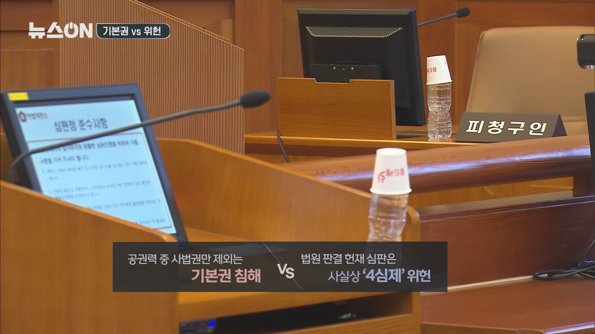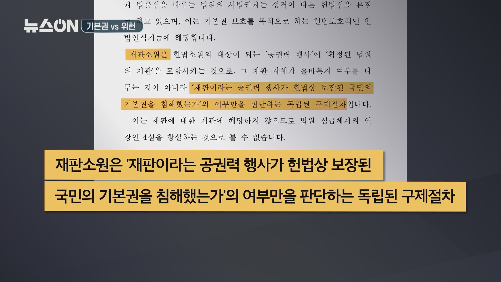 ‘4심‘은 재판소원 왜곡 헌재는 언론 참고자료를 배포하면서 4심제 표현은 재판소원 본질을 왜곡할 수 있다고 했습니다. "재판소원은 재판 자체가 올바른지 여부를 다투는 것이 아니라 '재판이라는 공권력 행사가 헌법상 보장된 국민의 기본권을 침해했는가' 여부만을 판단하는 독립된 구제 절차"이며 "재판에 대한 재판에 해당하지 않으므로 법원 심급체계의 연장인 4심을 창설하는 것으로 볼 수 없다."라고 강조했습니다.