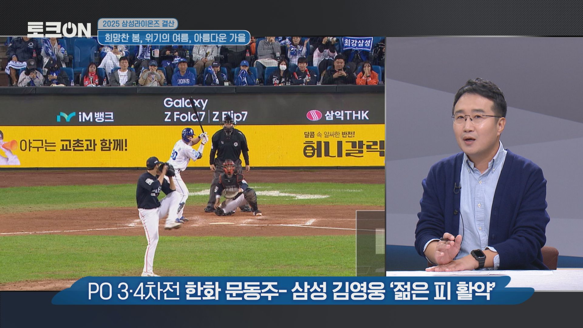 2025년 가을 야구는 아마 송 위원님도 동의하실 겁니다. 일단은 비가 주인공입니다. 비 때문에 경기가 많이 밀리고 앞에 한 3~4 경기는 비의 영향을 안 받은 경기가 거의 없었습니다. 예를 들어 와일드카드는 비 때문에 좀 늦게 시작했고요. 그러다 보니까 양 팀 선발들이 굉장히 애를 먹었습니다. 그런 점들이 경기에 미묘한 영향을 줬지만 이건 양 팀 똑같이 영향이 간 점이고요. 저는 준플레이오프든 플레이오프든 각 4차전이 꽤 짜릿했고 삼성이 제일 좋은 모습을 보였다고 생각합니다. 준플레이오프 4차전은 디아즈 선수의 홈런 장면이 아마 팬들한테 굉장히 강렬했을 거고요. 플레이오프 4차전에서 김영웅 선수의 홈런 두 방이 있었습니다.