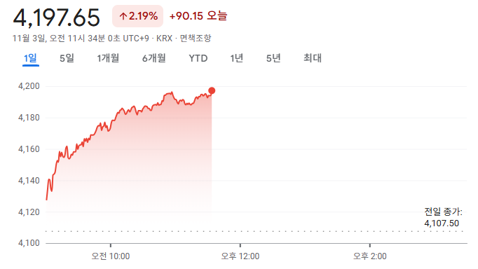 11월 3일 코스피지수는 지난주 금요일보다 0.39% 오른 4,123으로 출발해 장중 상승폭을 키워 오전 한때 4,197까지 오르며 장중 역대 최고치를 갈아치웠습니다.