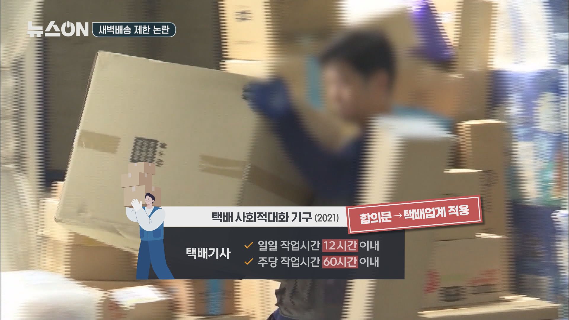 지난 2021년에 사회적 대화 기구를 통해서 택배기사들의 일일 작업시간을 12시간 이내로 하는 것과 주당 60시간 이내 등에 합의했고 택배업계에 적용이 됐습니다.