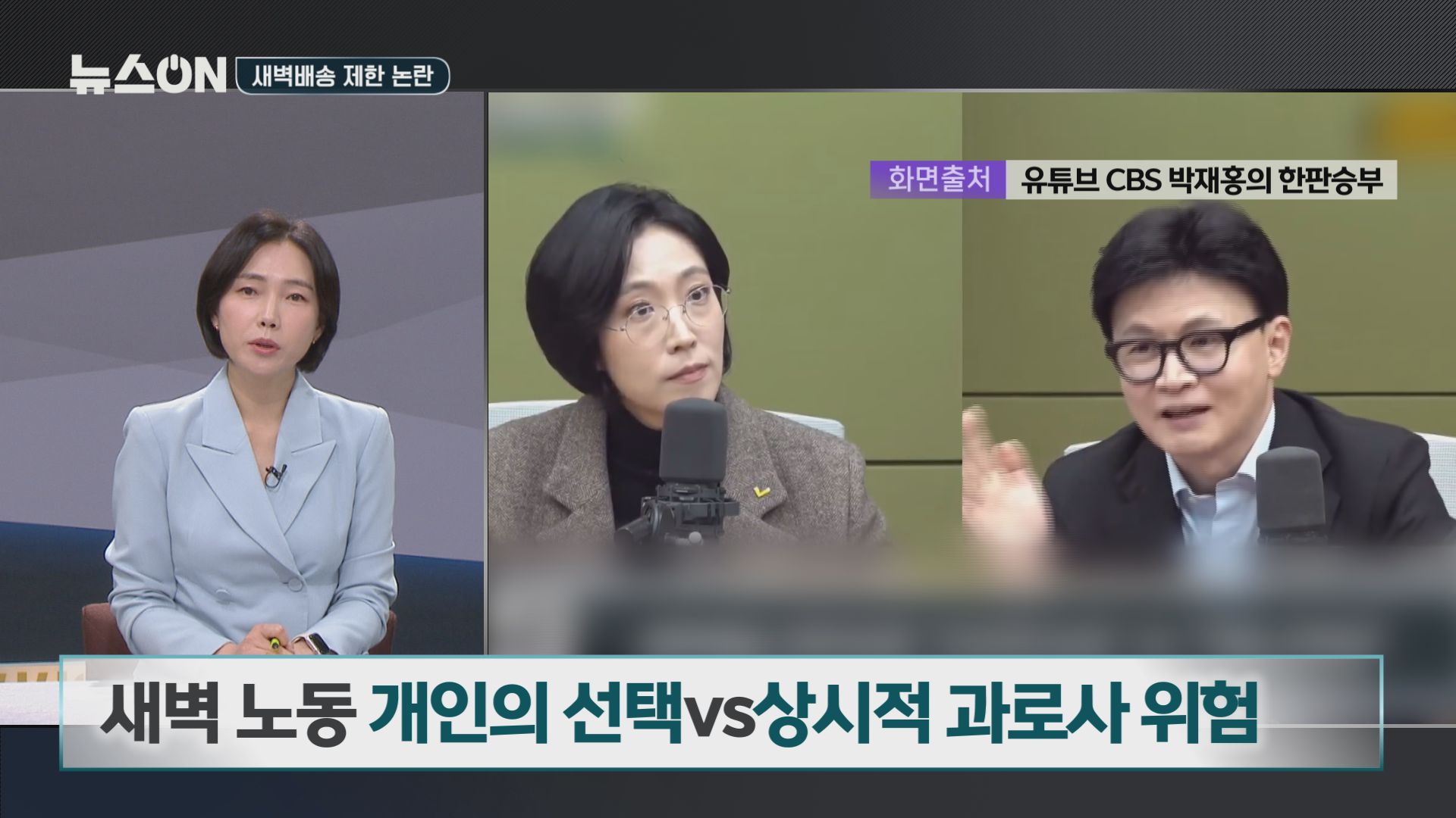 한동훈 전 국민의힘 대표와 장혜영 정의당 전 의원은 한 방송에서 토론을 벌였습니다. 새벽 배송 근무는 강요 아닌 선택이다, 상시적 과로사 위험이 있다는 의견이 맞섰습니다. 민주노총 택배노조는 택배 노동자의 건강권, 수면권을 보장해야 한다는 취지로 오전 5시부터 오후 3시에 출근하는 주간 연속 2교대제 도입도 제안했습니다.