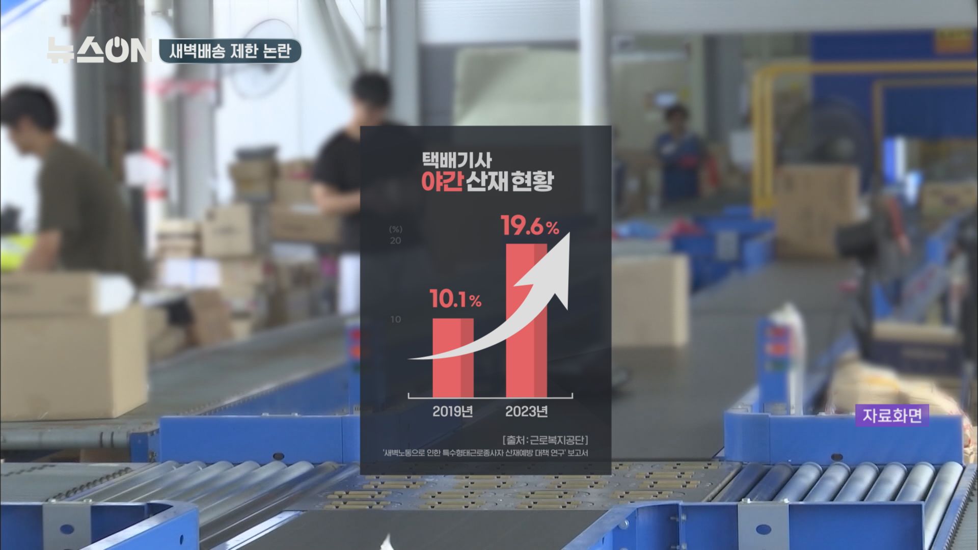 근로복지공단 자료에 따르면 지난 2019년~2023년 택배기사 야간 산재 재해자는 10.9%에서 2023년 19.6%로 늘었습니다. 택배기사들을 상대로 한 설문조사에서도 새벽 배송으로 인한 육체적 부담을 호소한 비율이 60%였습니다. 노동계는 야간 노동은 세계보건기구가 2급 발암 요인으로 분류할 만큼 위험하다는 입장입니다. 유럽연합은 자정에서 새벽 5시 사이 일하는 노동자를 야간 노동자로 분류하고 하루 노동 시간을 8시간 이하로 제한하고 있습니다.