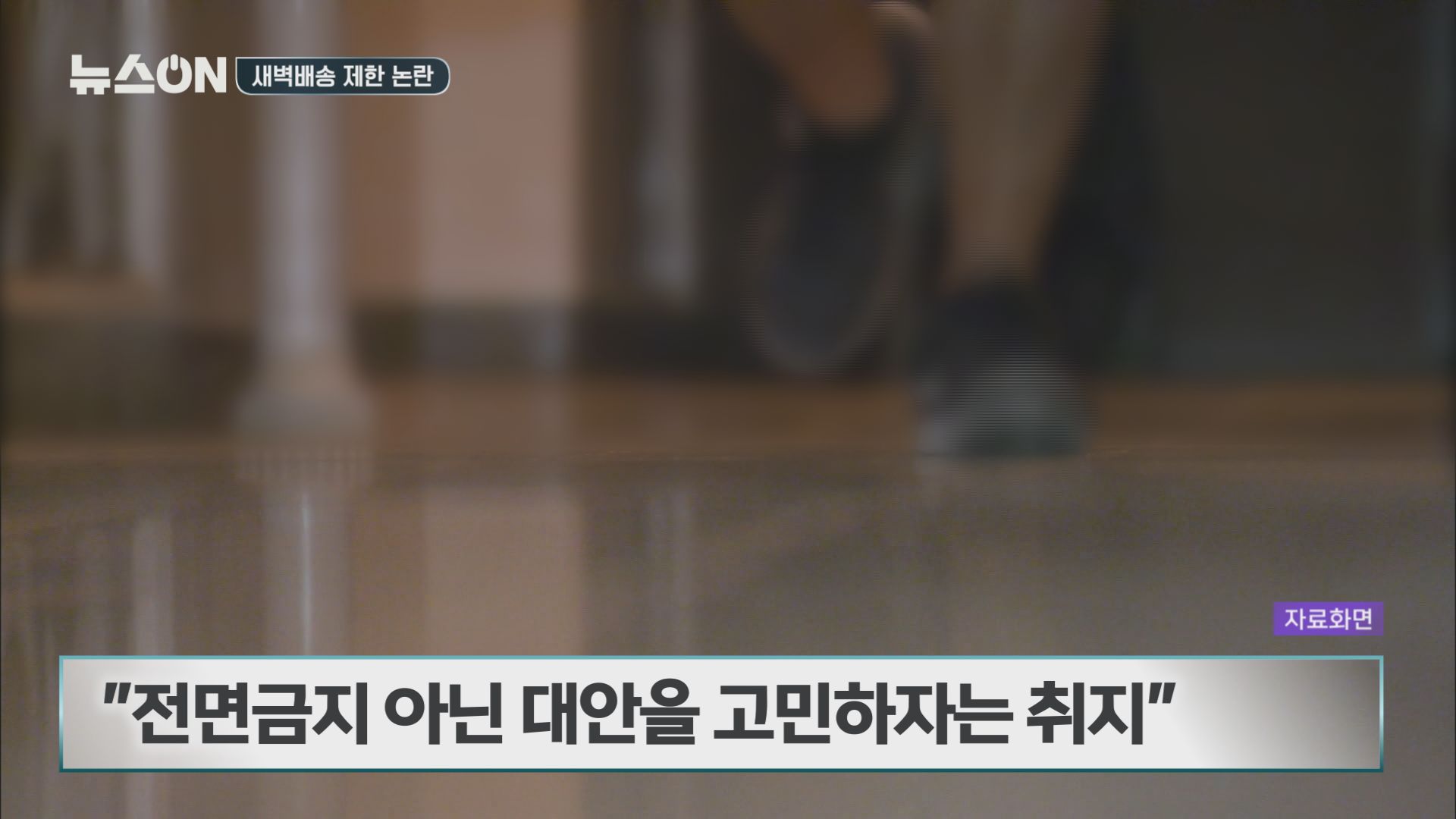 전면 금지를 주장한 게 아니라 새벽 배송 필수 품목을 지정하거나, 배송 물량을 조절하는 등의 다양한 대안도 제시했다면서 새벽 배송 전면 금지를 주장하지 않았다, 과로 위험이 큰 초심야 시간대 근무를 조절할 수 있는 방법을 고민해 보자는 취지였다는 입장입니다.