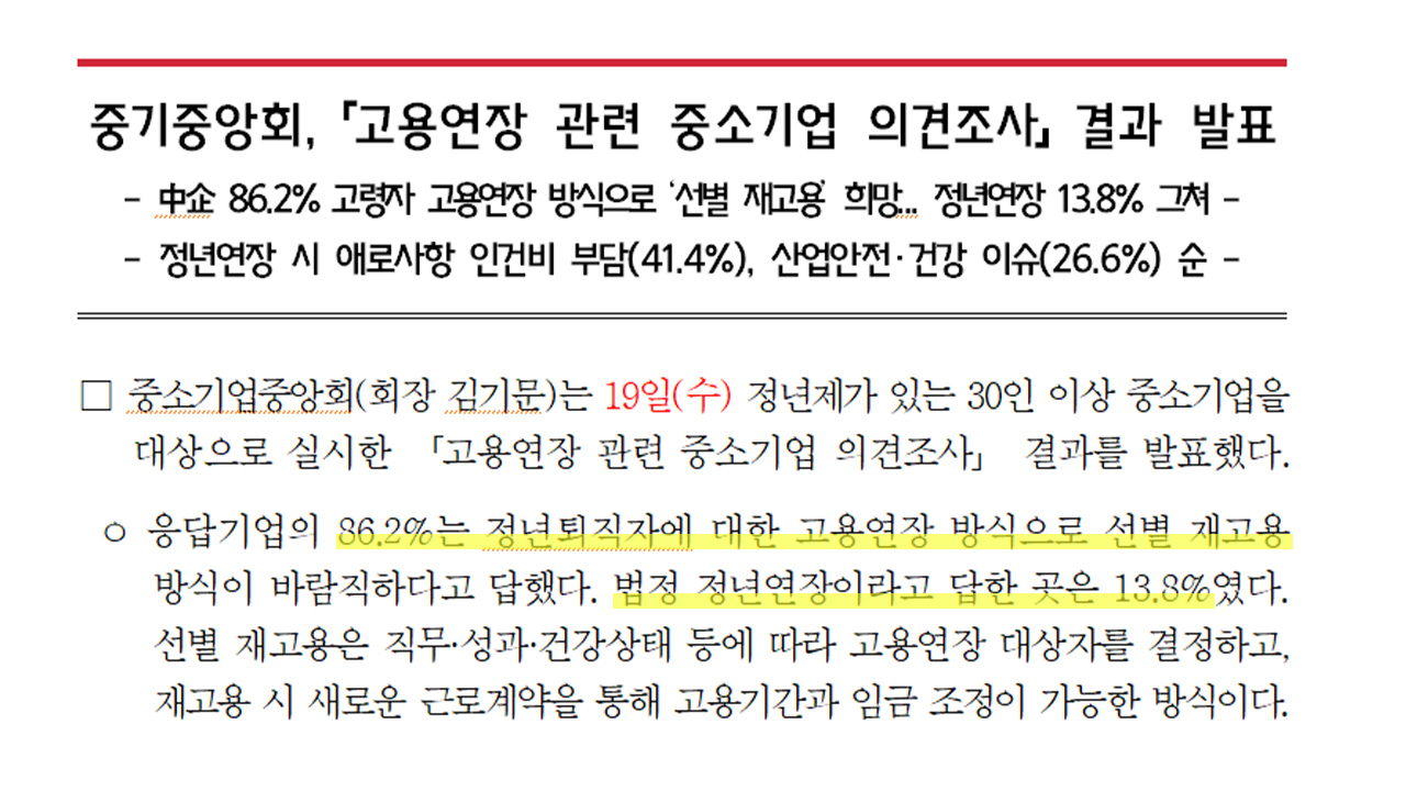 중소기업중앙회가 정년제가 있는 30인 이상 중소기업을 대상으로 '고용 연장 관련 중소기업 의견 조사'를 실시한 결과, 응답 기업의 86.2%는 정년퇴직자에 대한 고용 연장 방식으로 선별 재고용 방식이 바람직하다고 답했습니다.