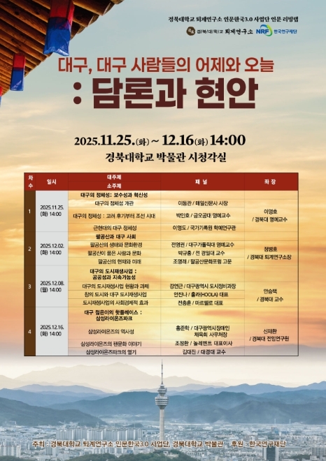 경북대학교 퇴계연구소는 '대구, 대구 사람들의 어제와 오늘'이라는 주제로 11월 25일부터 12월 16일까지 네 차례에 걸쳐 토론회를 엽니다.