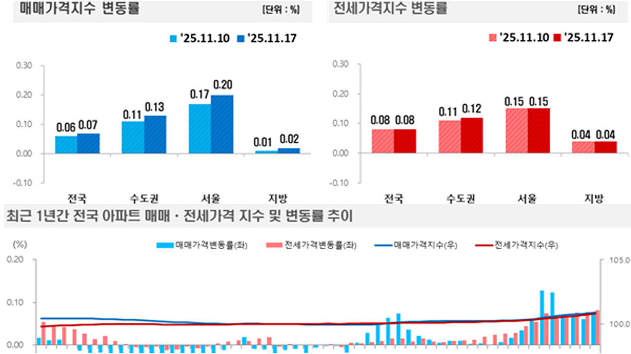 전국 아파트 매매가격은 0.07% 상승, 전셋값은 0.08% 상승을 기록했습니다.