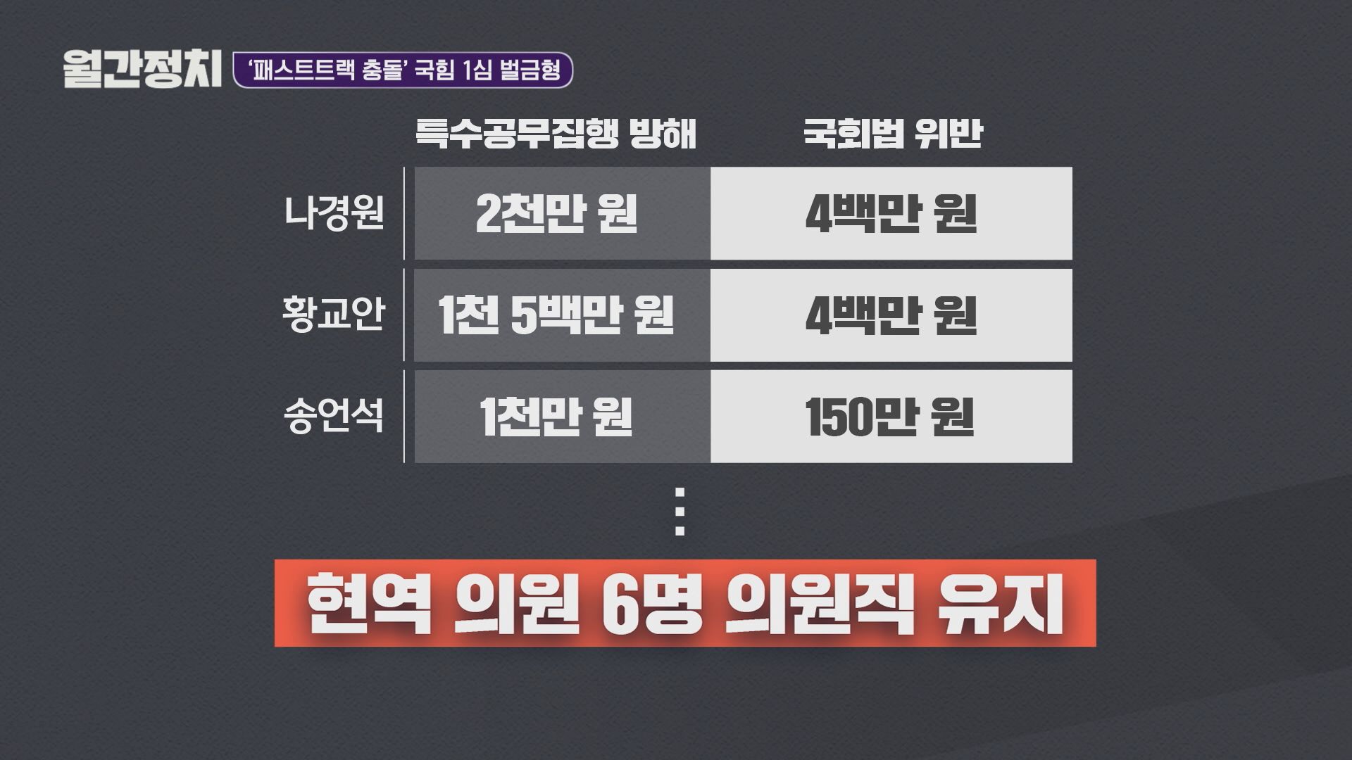 두 분 다 국민의힘보다는 민주당의 속도나 강도에 대해서는 좀 우려한다는 느낌이 드는 것 같습니다. 대장동 사건 같은 경우에는 2심 그리고 뭐 결심까지 갈 수도 있겠죠. 내내 논란이 될 것 같으니 한번 지켜보도록 하고 최근에 나왔던 정치권 뉴스 하나 더 살펴보고 다음 주제로 넘어갈게요. 패스트트랙 법안 두고 충돌 물리적 충돌 빚은 것과 관련해서 일단 국민의힘 의원 6명과 당직자 등 26명에 대한 1심 선고가 나왔거든요. 6년 7개월 만에 나왔는데 이 판결은 어떻게 보십니까?