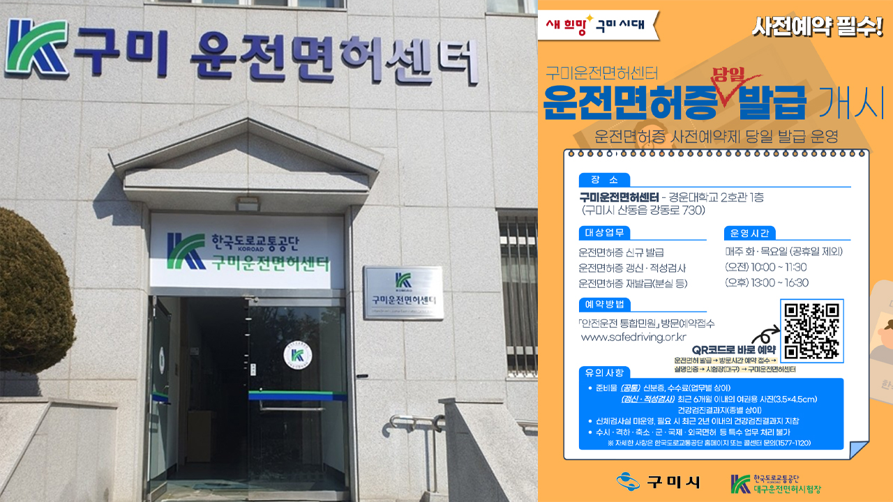 구미시는 한국도로교통공단 대구운전면허시험장과 협력해 구미 운전면허 센터(구미시 산동읍 경운대학교 2호관)에서 운전면허 발급 서비스를 하게 됐다고 밝혔습니다.