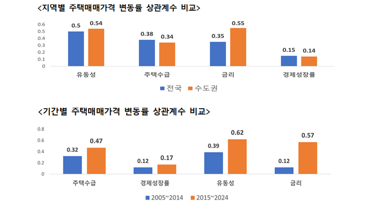 수도권에만 한정해서 영향 요인을 비교해 보면 금리(-0.55), 유동성(0.54), 주택 수급(0.34), 경제성장률(0.14) 순으로 나타나 금리와 유동성의 영향력이 다른 지역보다 컸습니다.