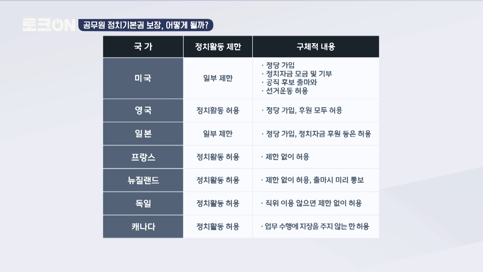 독일 연방행정법원이 2017년 공무원의 정치적 표현의 자유와 관련한 판결에서 직무와 무관한 영역에서는 폭넓은 활동을 허용하라고 했습니다. 상급자나 대통령에 대한 비판도 허용했습니다. 미국은 1939년 해치법으로 정치활동을 전면 금지했지만 1993년에 개정해 ‘직무 외 활동은 전면 허용’으로 바뀌었습니다. 프랑스도 복종 의무는 유지되지만 직무와 관련 없고 선거 개입 목적이 아니라면 폭넓게 허용합니다. OECD 전체에서 우리만 전면 금지이기 때문에, 저 역시 원칙적으로 직무와 무관한 영역에서는 허용하는 방향으로 가야 한다고 봅니다.