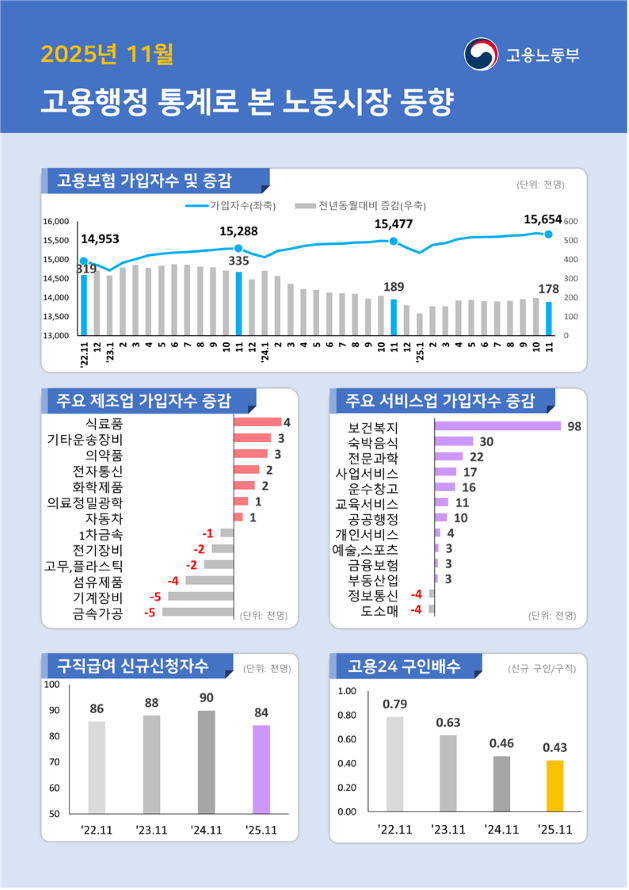 고용노동부가 발표한 '2025년 11월 고용 행정 통계로 본 노동시장 동향' 자료를 보면, 2025년 11월 말 기준 고용보험 상시 가입자 수는 1,565만 4천 명으로, 1년 전보다 17만 8천 명(1.1%) 증가했습니다.