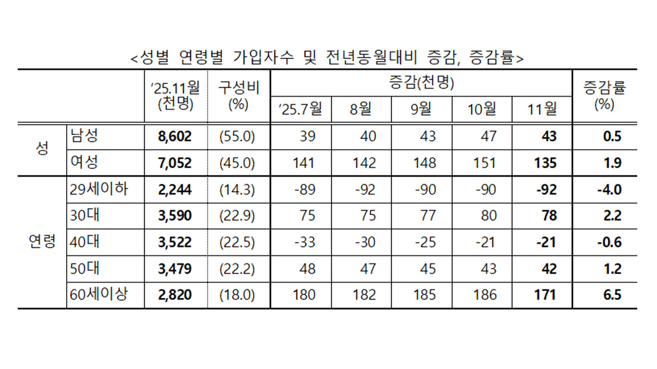 29살 이하 가입자는 1년 전보다 9만 2천 명 감소하며 2022년 9월 이후 39개월 연속 감소세를 이어갔습니다.