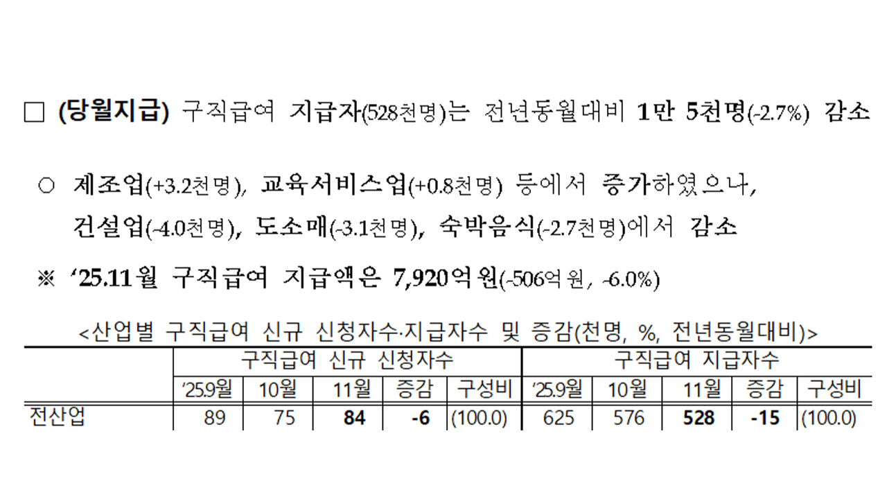 구직급여 신규 신청자(8만 4천 명)와 지급자(52만 8천 명)는 모두 전년 동월 대비 감소했고 지급액은 7,920억 원으로 506억 원 감소했습니다.