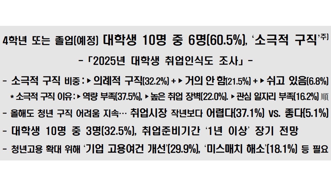 한국경제인협회(한경협)가 지난 10월 1일부터 11월 19일까지 전국 4년제 대학 재학생 및 졸업자 등 2,492명을 대상으로 실시한 '2025년 대학생 취업인식도 조사' 결과, 4학년 재학생 또는 졸업자(유예·예정 포함) 중 60.5%가 구직 기대가 낮은 '소극적 구직자'인 것으로 집계됐습니다.