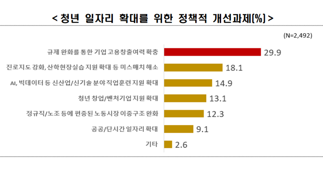 대학생들은 청년 취업난 해소를 위한 정책적 개선 과제로 '규제 완화 등 기업 고용 여건 개선'(29.9%)을 가장 많이 선택했습니다.
