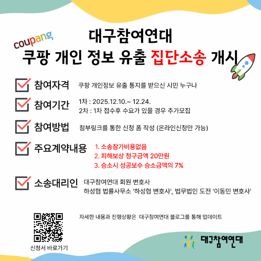 대구참여연대는 쿠팡을 상대로 손해배상청구 집단소송을 추진하며 12월 24일까지 1차 원고를 모집한다고 밝혔습니다.