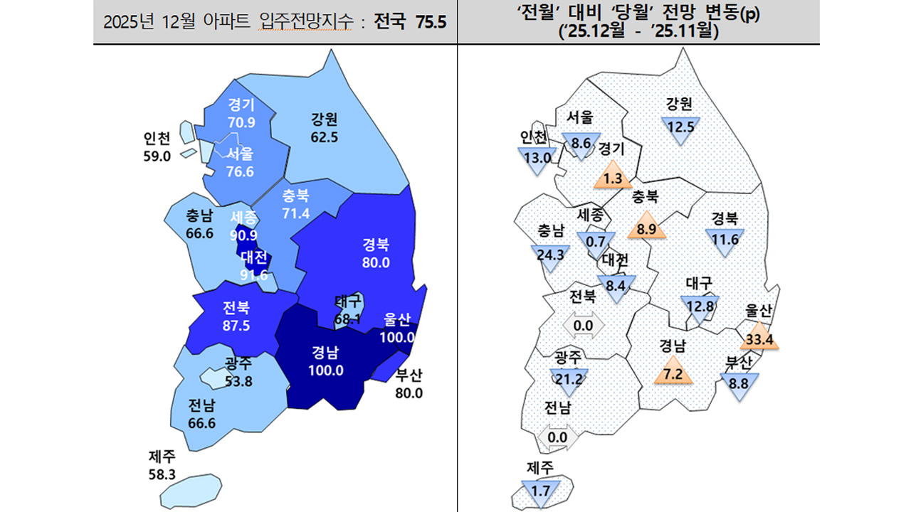 주택산업연구원이 주택사업자를 대상으로 설문 조사한 결과, 12월 전국 아파트 입주전망지수는 75.5로 전월보다 4.3포인트 하락했습니다.