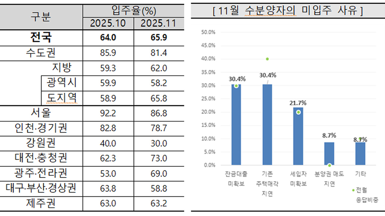11월 전국 아파트 입주율은 65.9%로, 10월 대비 1.9% 포인트 상승한 것으로 조사됐습니다.