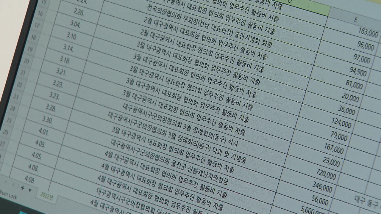 당시 대구시 구군의회 의장협의회 예산과 지출을 담당한 동구의회에 묻자, '탈탈 털어도 일정과 지출 결의서가 전부'라는 답이 돌아왔습니다.