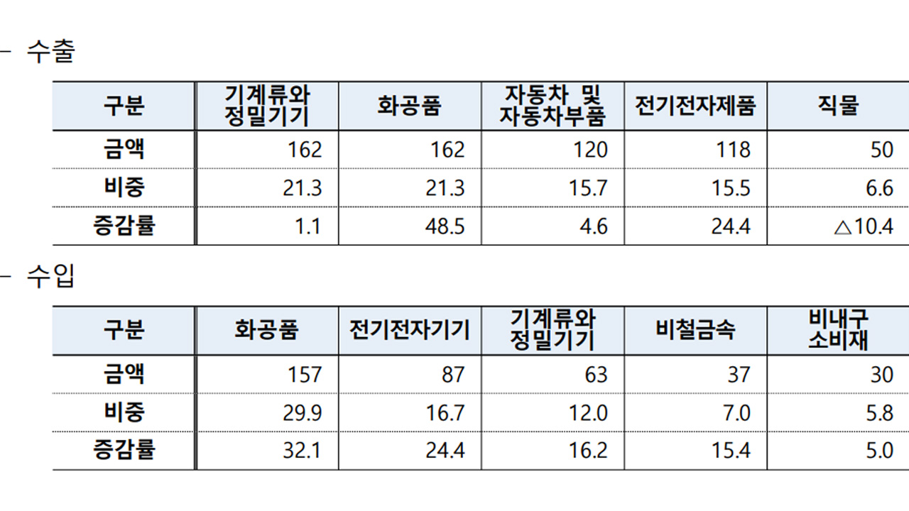 품목별로 보면, 수출은 기계류와 정밀 기기(1.1%), 화공품(48.5%), 자동차 및 자동차 부품(4.6%), 전기전자제품(24.4%)은 증가했고, 직물(△10.4%)은 감소했습니다.