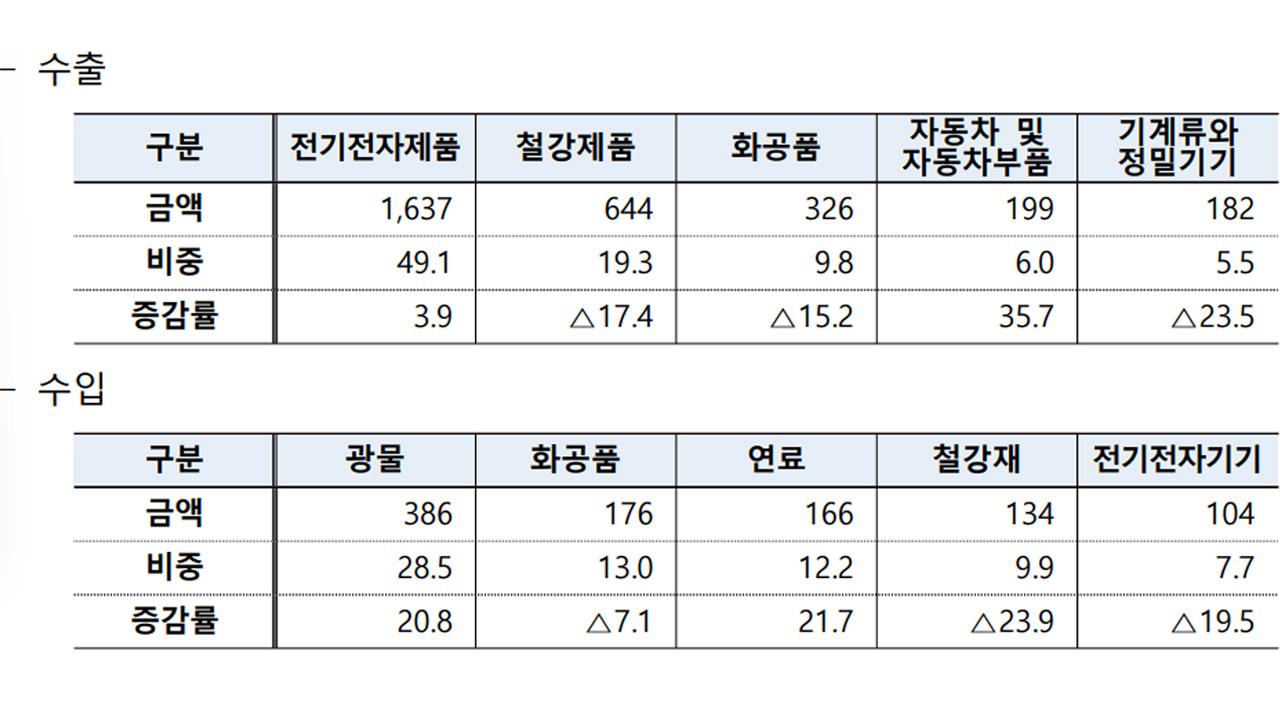품목별로 보면, 수출은 전기전자제품(3.9%), 자동차 및 자동차부품(35.7%)은 증가했고, 철강 제품(△17.4%), 화공품(△15.2%), 기계류와 정밀 기기(△23.5%)는 감소했습니다.