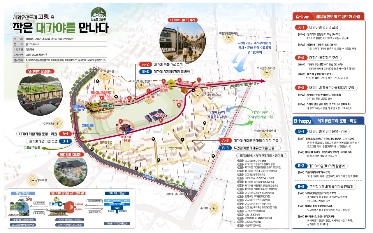 고령군은 세계문화유산으로 지정된 지산동 고분군과 대가야 고도 지정 등의 특색을 살려 가족 친화형 체험 거점 시설과 대가야 특화 거리를 조성합니다.
