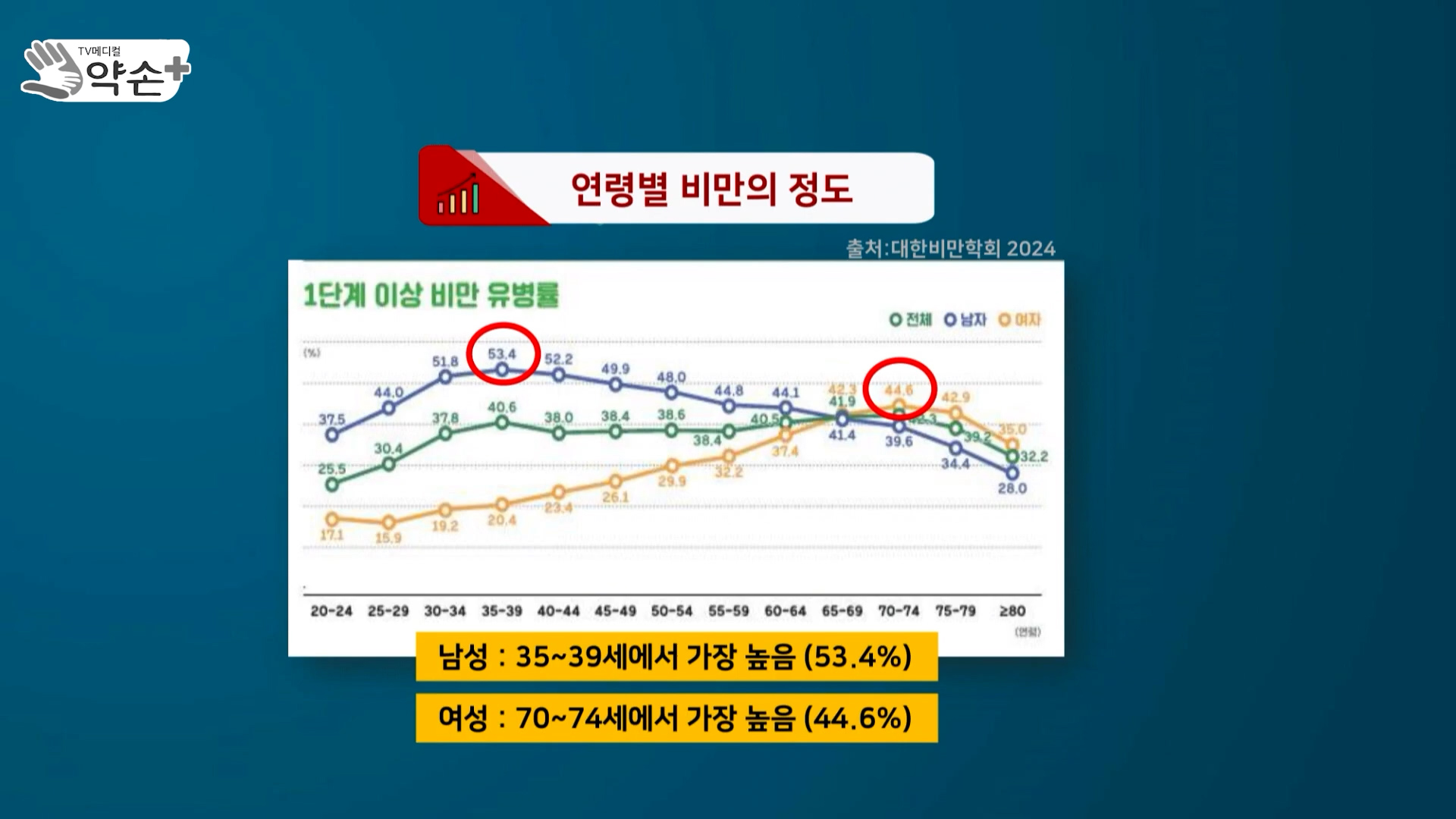 아무래도 여성들은 평생 체중에 민감하다 보니 유지하고 관리하다가 노년에 조금 올라가는 경향도 있지 않나 싶기도 하고요. 또, 한창 사회생활하는 30~40대 남성들의 비만율이 높다고 하니 스트레스와도 관련이 있지 않나 하는 생각도 들거든요?
