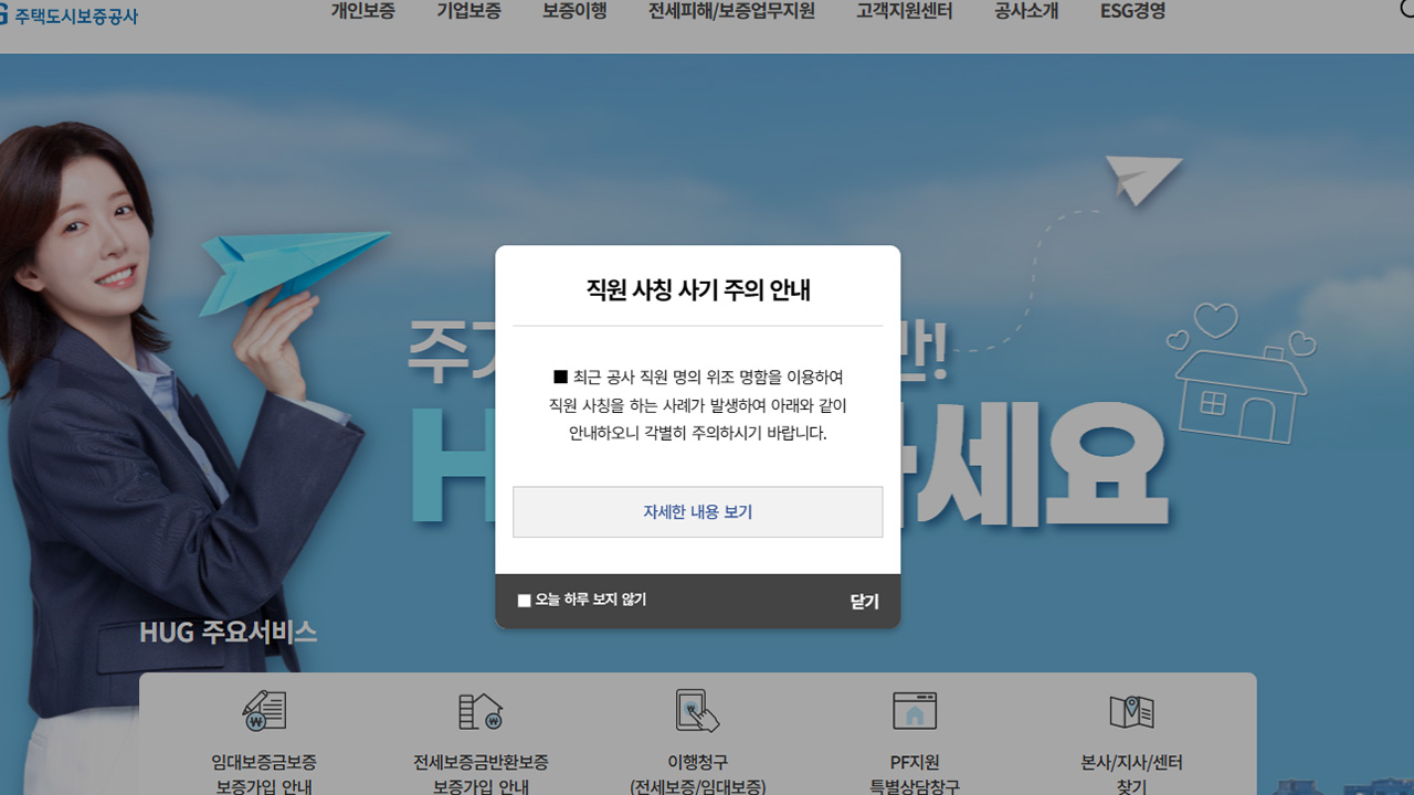 주택도시보증공사는 긴급하게 물품 선구매 등을 요청하지 않고, 계약과 상관없는 일체의 행위를 진행하지 않는다며 먼저 공사 홈페이지에 게시된 부서의 공식 연락처와 공사 발주부서 담당자와 통화해 사실인지 확인할 것을 강조했습니다.