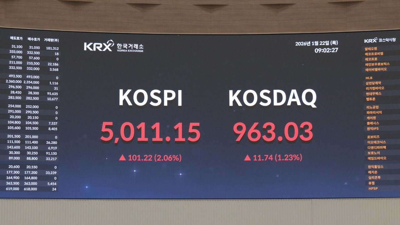 장 초반 5000선을 돌파했던 코스피는 가파른 상승폭을 보였고, 한때 5019.54까지 기록해 지난해 10월 종가 기준 4000선을 처음 넘은 이후, 3개월 만에 '오천피' 고지에 올랐습니다.