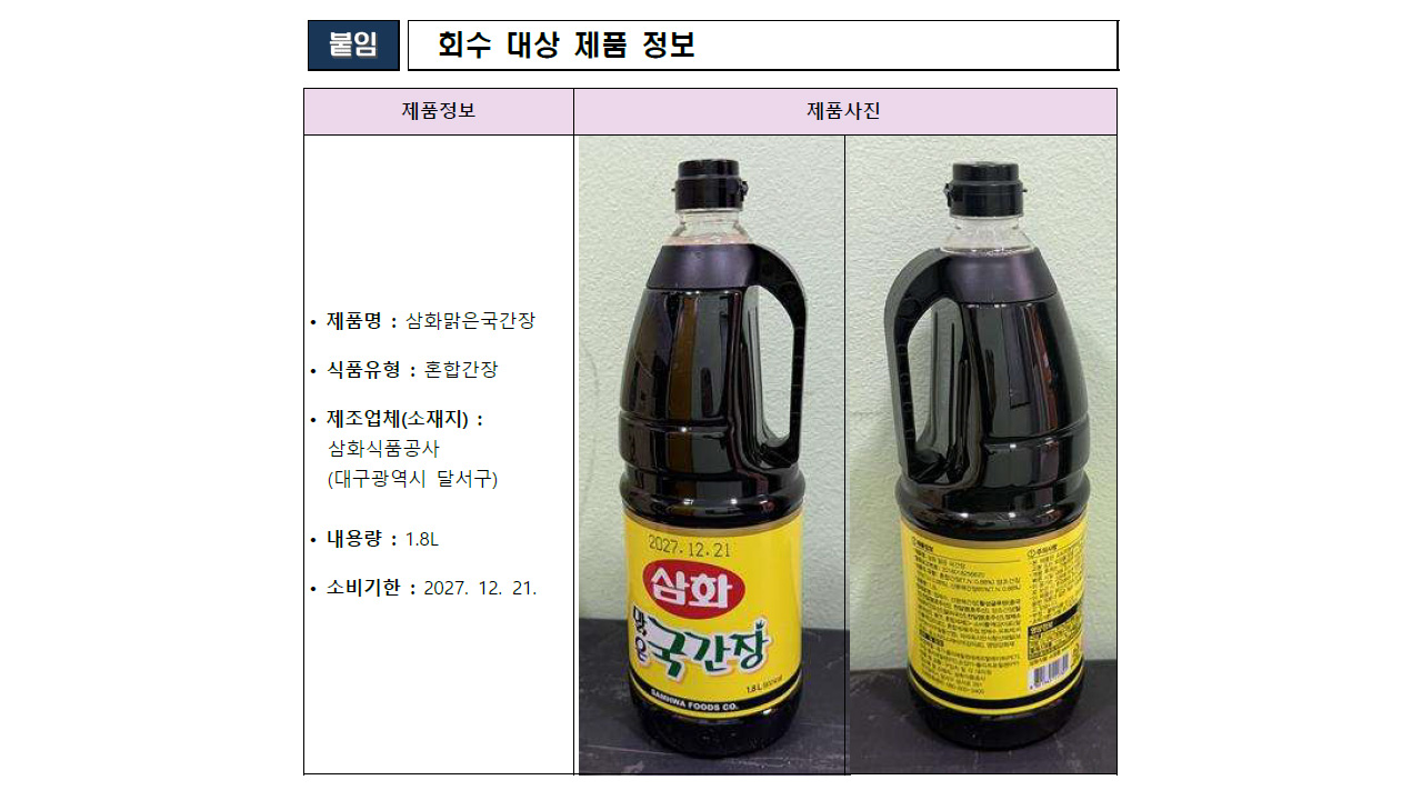 대구 달서구에 있는 삼화식품공사의 '삼화맑은국간장'에서 유해 물질이 기준치를 크게 넘어서 식약처가 제품 판매를 중단하고 회수 조치를 내렸습니다.