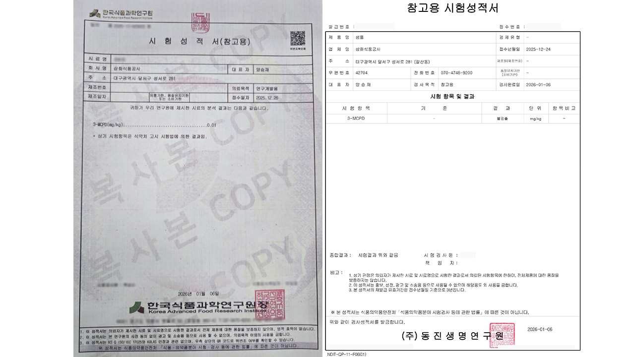 이들이 공개한 시험성적서를 보면 한국식품연구원 검사 결과 기준치를 밑도는 0.01㎎/㎏의 3-MCPD가 검출됐고, 동진생명연구원의 검사에서는 해당 물질이 검출되지 않았습니다.
