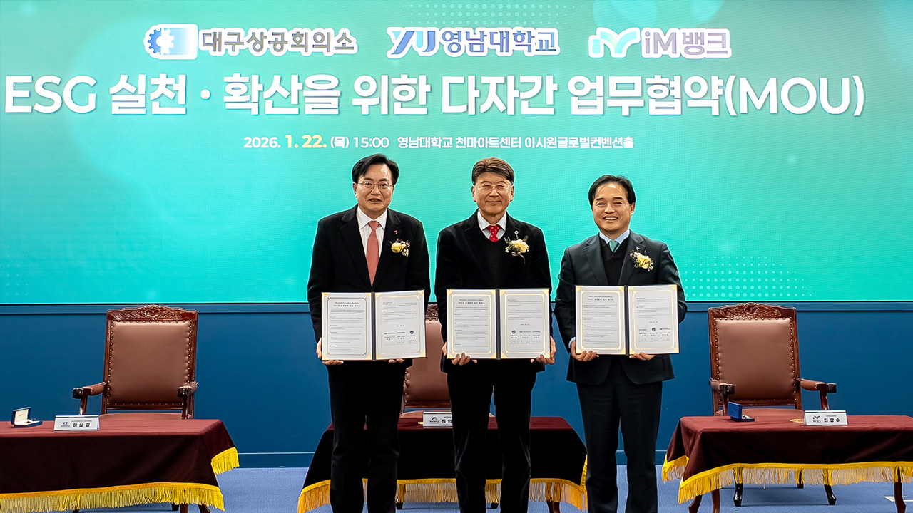 영남대학교는 iM뱅크, 대구상공회의소와 함께 지역사회 ESG 가치 확산과 지속 가능한 생태계 조성을 위한 다자간 업무협약을 체결했습니다.