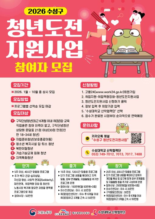 참여 신청이나 자세한 사항은 수성구청소년센터나 고용 24 홈페이지에서 확인할 수 있습니다.