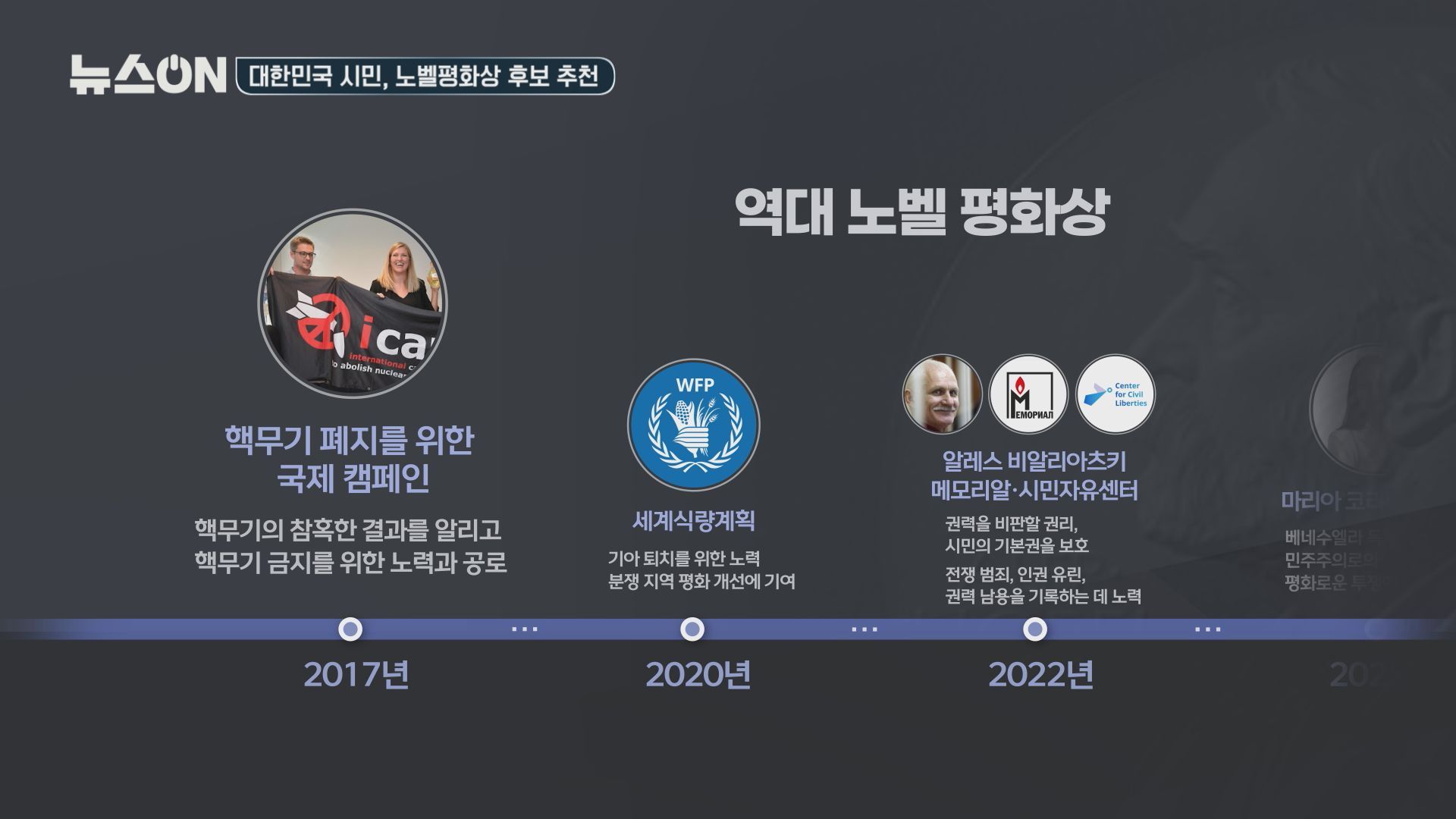 2022년에는 전쟁범죄와 인권유린을 비판하고 알린 벨라루스 인권운동가인 알레스 비알리아츠키와 러시아와 우크라이나 인권단체가 수상했고요. 2020년에는 기아 퇴치를 위한 노력과 분쟁 지역의 평화 환경 개선에 기여한 공로로 세계식량계획이, 2017년에는 핵무기가 낳은 참혹한 결과를 알리고 핵무기 금지를 위한 노력을 기울인 공로로 핵무기 폐지를 위한 국제 캠페인이 노벨평화상을 받았고요. 2012년에는 유럽의 평화화 화해, 민주주의 증진에 기여한 공로로 유럽연합이 수상한 바 있습니다.