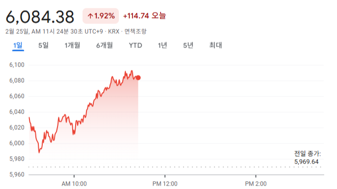 2월 25일 코스피가 시작하자마자 6천을 돌파했습니다.