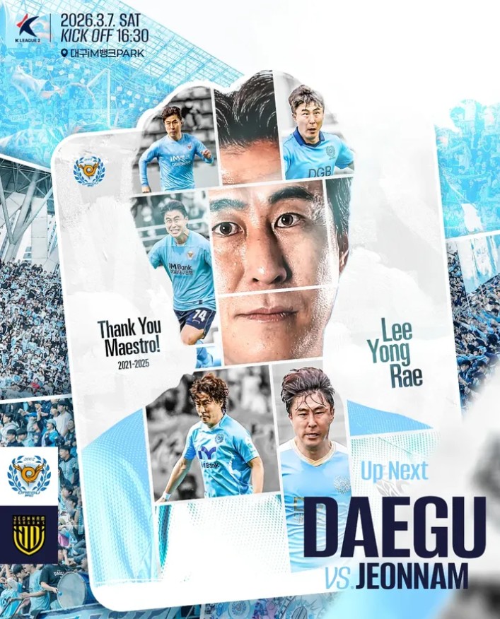 3월 7일 오후 4시반 대구iM뱅크파크에서 펼쳐지는 하나은행 K리그2 2026 전남드래곤즈와의 2라운드에서 대구는 이용래 은퇴식을 개최합니다.